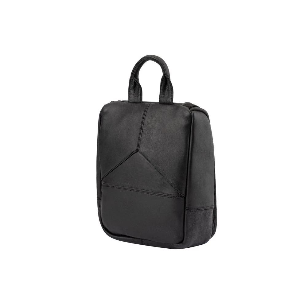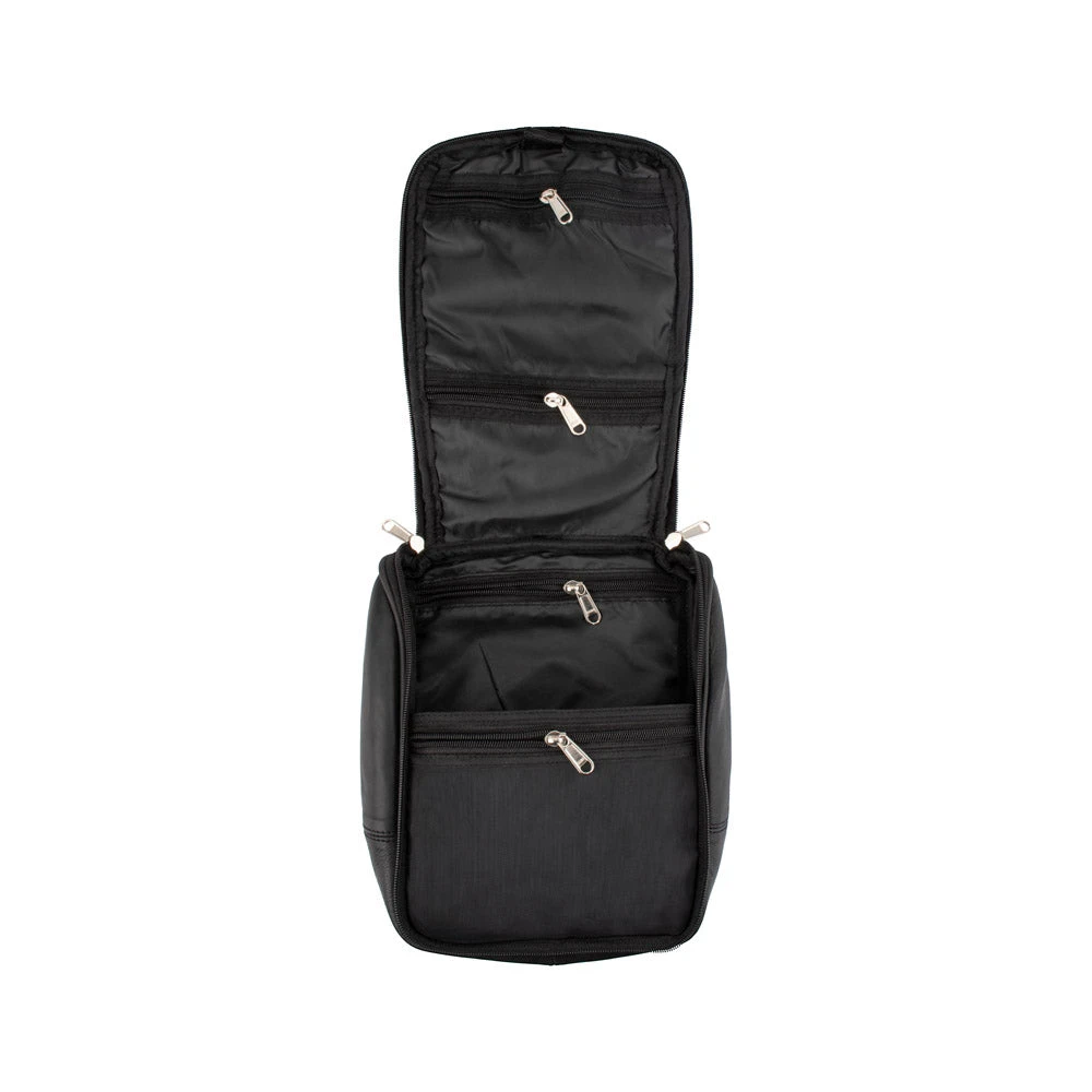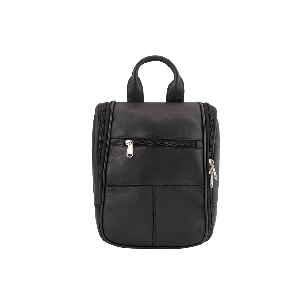 Soft leather Hanging Shaving Kit, double zip single compartment opening with two zip pockets on inside flap and one on the outside. Â Inside has a mesh zip pocket, elastic holders for tooth brushes and a rear zip pocket.