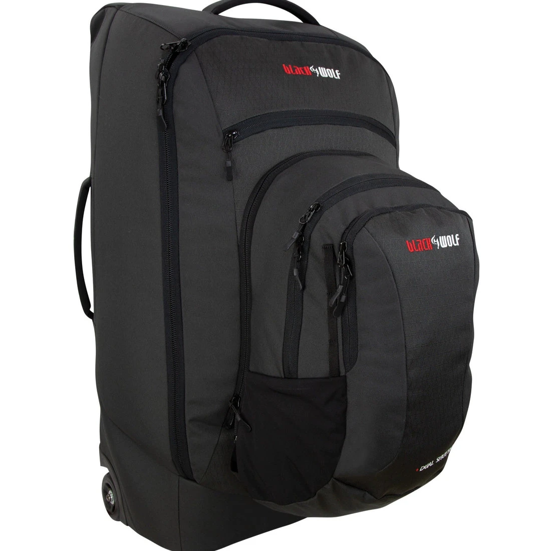 - Main Bag: New BlackWolf ‘Origins’ 3D EVA comfort foam harness in padded zip out pocket, extendable handle on main bag, super tough all terrain wheels, zip on Daypack as standard, lockable zips, soft foam handles, extra zip closure front pocket