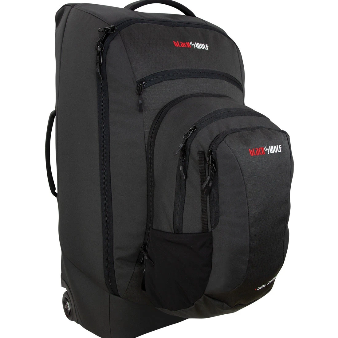- Main Bag: New BlackWolf ‘Origins’ 3D EVA comfort foam harness in padded zip out pocket, extendable handle on main bag, super tough all terrain wheels, zip on Daypack as standard, lockable zips, soft foam handles, extra zip closure front pocket