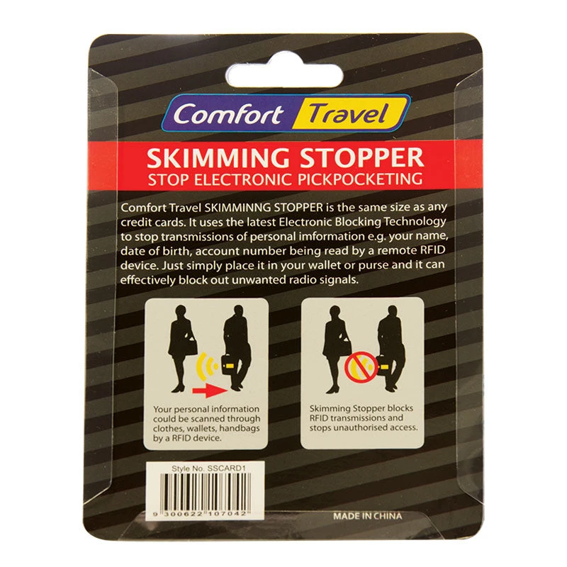 Comfort Travel SKIMMINNG STOPPER is the same size as any credit cards. It uses the latest Electronic Blocking Technology to stop transmissions of personal information e.g. your name, date of birth, account number being read by a remote RFID device. Just simply place it in your wallet or purse and it can effectively block out unwanted radio signals.