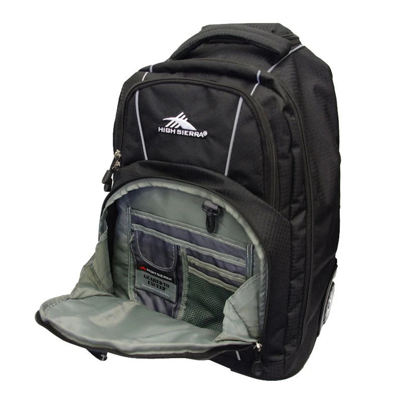 - Large, zippered front compartment has deluxe organizer with media pocket, multiple open pockets and key fob