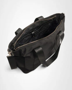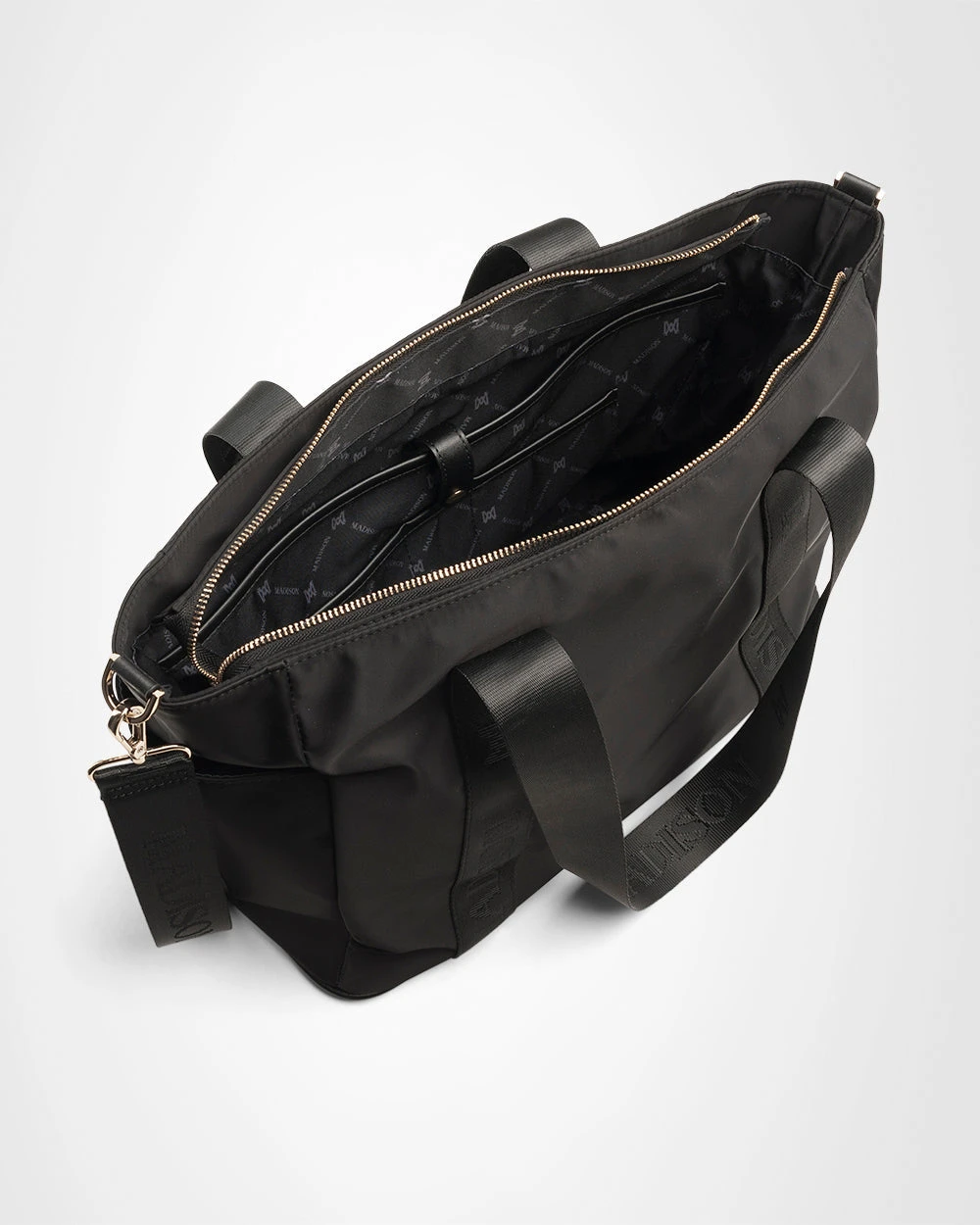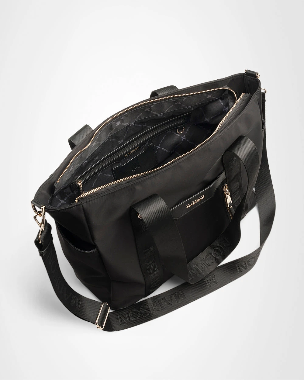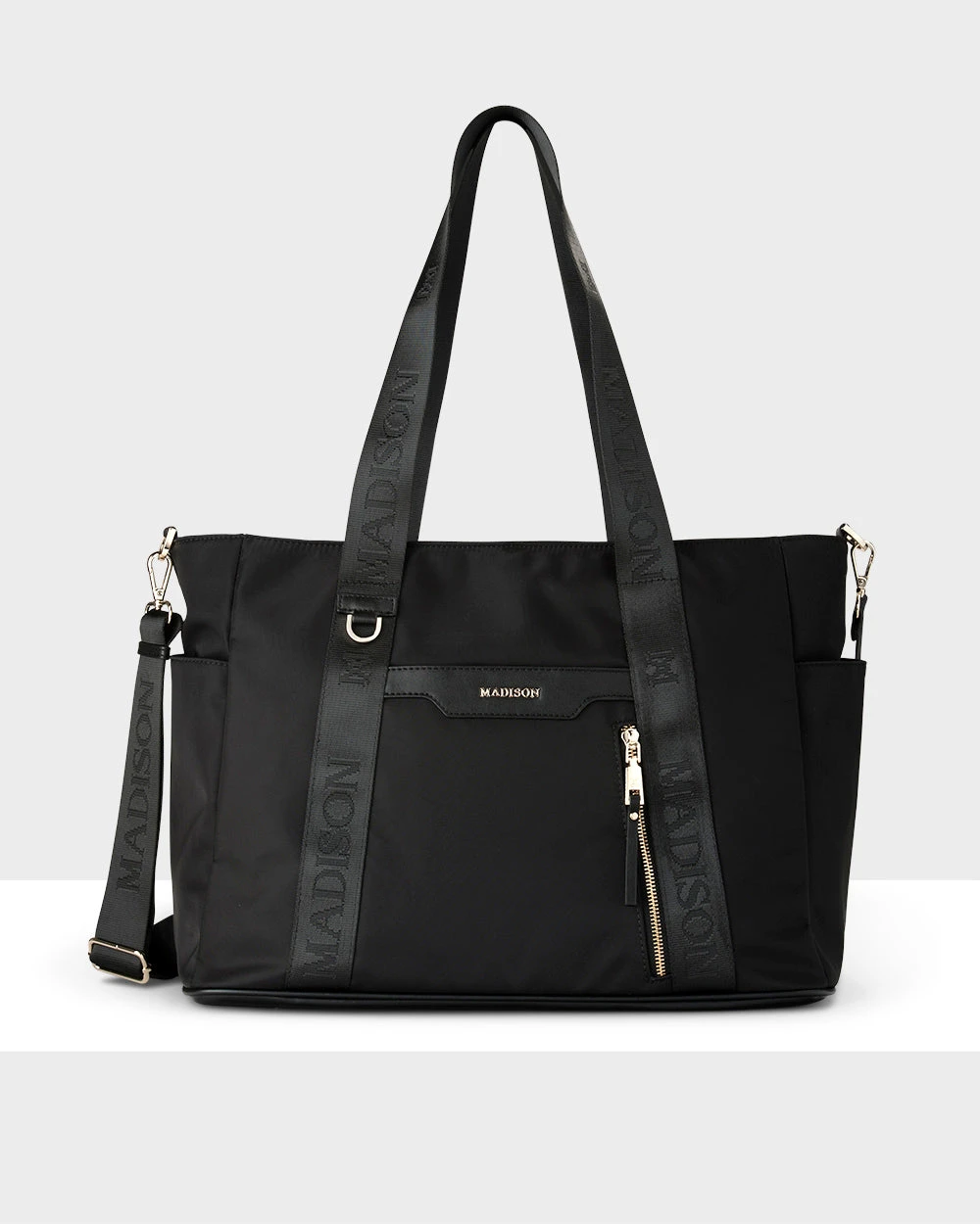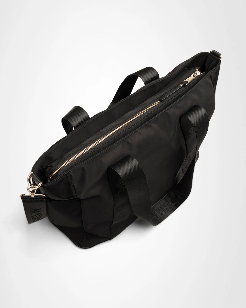 This large carry-all tote has endless versatility of being the ideal gym, work or overnight bag. Its high on detail as well as function, with luxe metal hardware and Madison monogram webbing. The lightweight nylon material is trimmed with our vegan leather, creating a light weight, durable and wipe clean bag. Its exterior pockets have the perfect location for your phone, water bottle and keys, making it an ideal travel bag option.