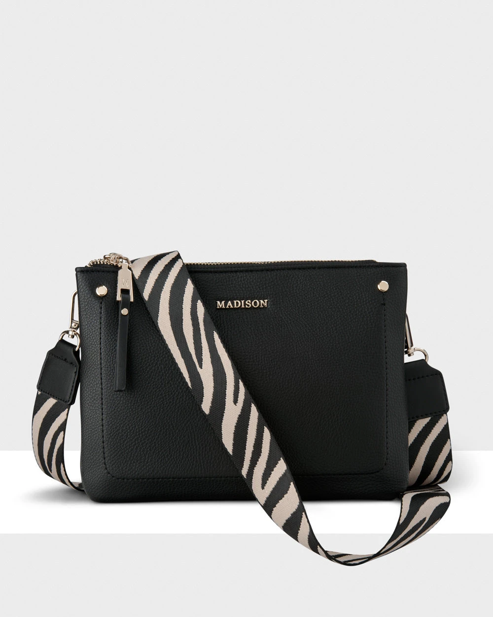 Our beloved Charlotte crossbody bag is given a bold update with the addition of a zebra patterned bag strap. Arriving with 2 strap options, you can quickly convert from an statement look with the webbing strap, or streamline your outfit by switching to the matching crossbody strap. Its double zip opening and 2 compartments allow for easy organisation. With additional rear and internal zips, there will be the ideal location for all your essentials. Made from premium vegan leather, certified by Vegan Australia this crossbody is not only cruelty free, but durable and made to last.