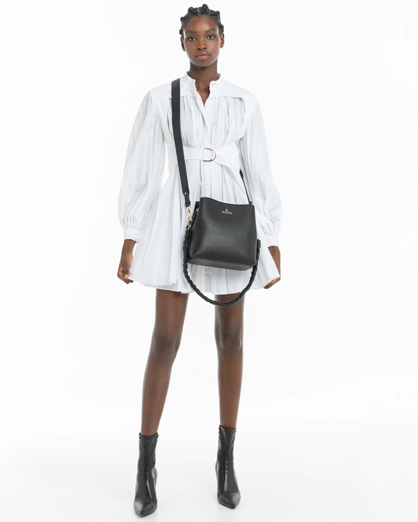This Joanie bucket bag is the perfect size to compliment any day out. With the additional versatility of interchanging between a plait bag strap or matching crossbody strap, you can create 2 entirely different looks. The plait strap creates are more casual boho effect, and has the additional feature of allowing you to convert your bag to one you can wear on your shoulder. A generous 3 compartment capacity will carry all your belongings with ease, while the crossbody strap allows you to remain hands free.