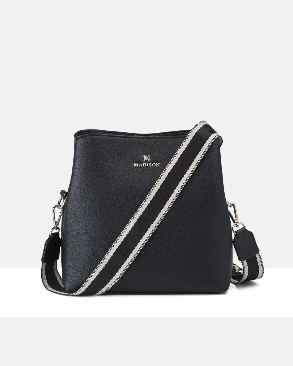 This Joanie bucket bag is the perfect size to compliment any day out. With the option of switching between 2 straps, your bag will suit a variety of looks. The Stripe Webbing Strap gives a modern casual effect, or change it up with the matching crossbody strap for a streamlined look. It has a generous 3 compartment capacity to carry your belongings, this is the ideal bag for when you carry extra items but remain hands free.
