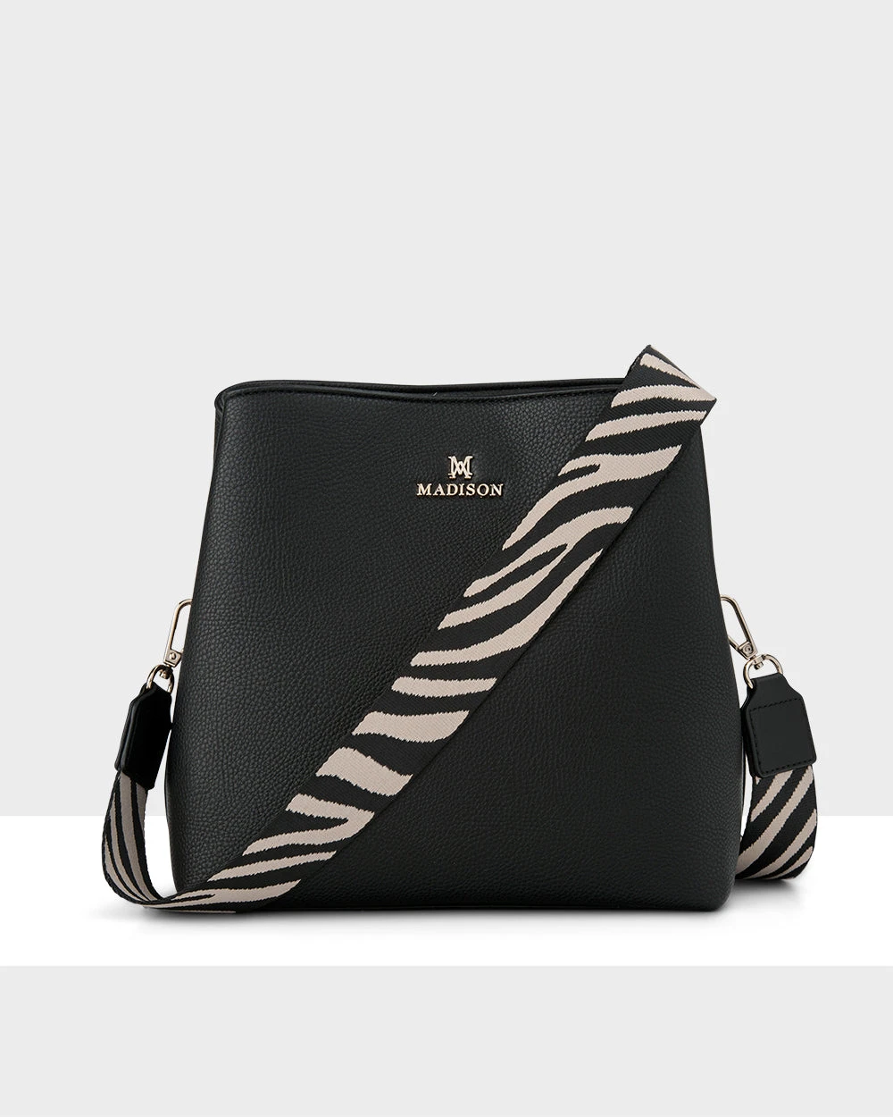 This Joanie bucket bag is the perfect size to compliment any day out. With the additional versatility of interchanging between a patterned Zebra bag strap or matching crossbody strap, you can create 2 entirely different looks. This bag has two spacious compartments closed by secure clasps, and an internal centre zip compartment to keep your valuables safe. It has a generous capacity to carry your belongings, this is the ideal bag for when you carry extra items but remain hands free.