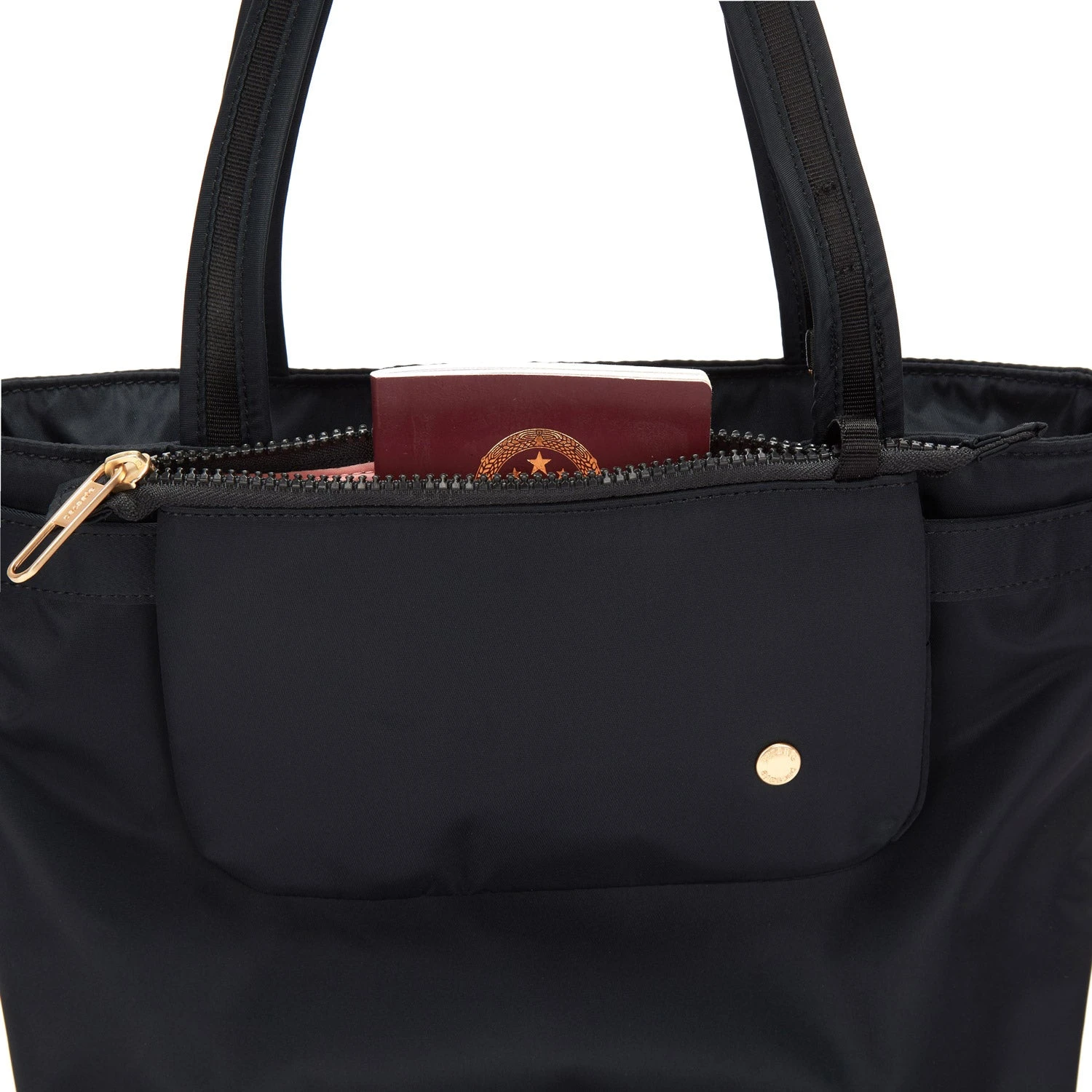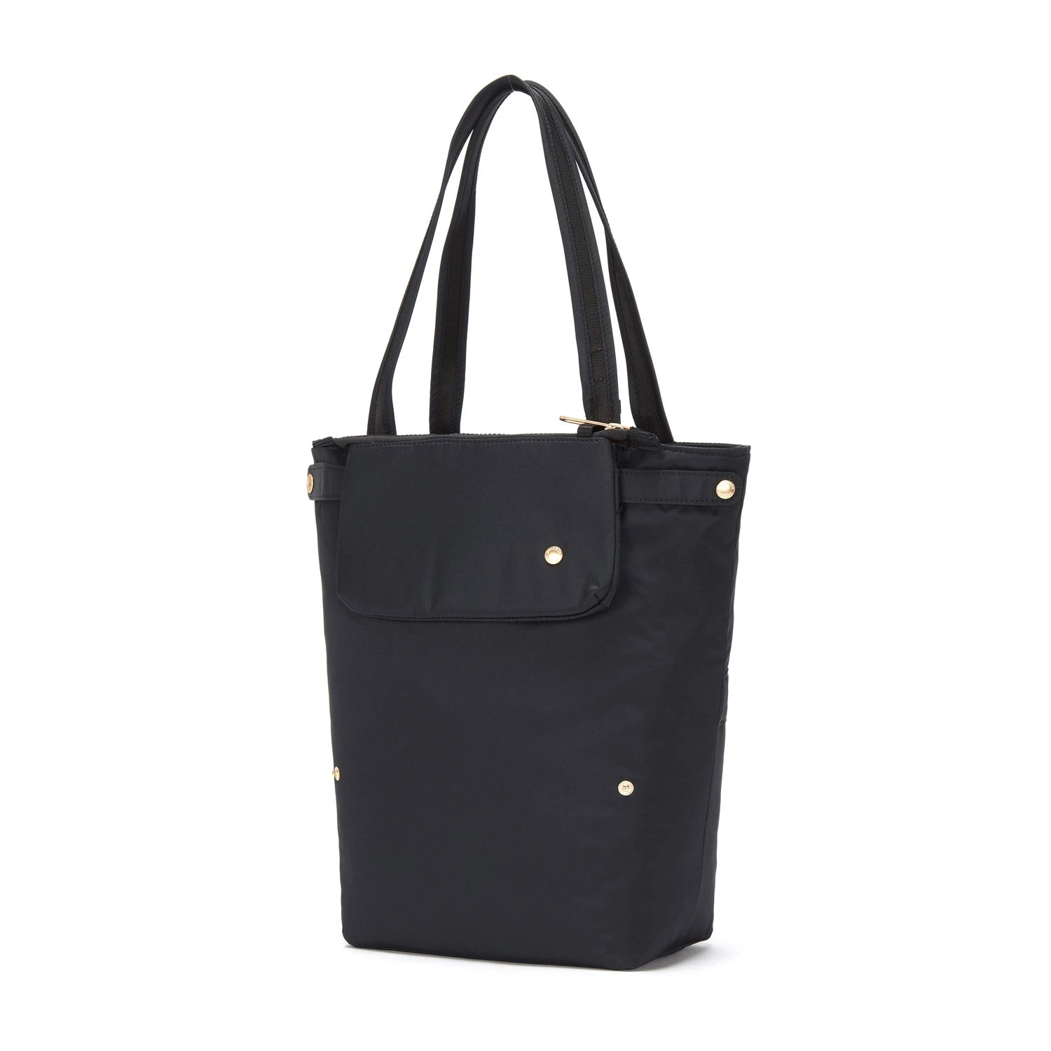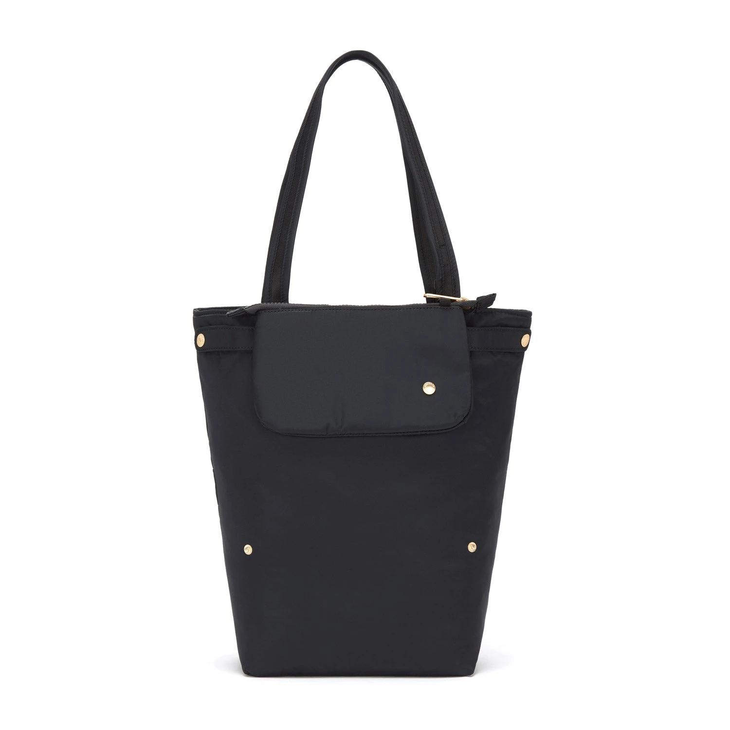 Be prepared for the unexpected with this versatile anti-theft bag that converts from a compact purse to a full-sized tote with several variations of ways to carry. Wear with pouch snapped to the front of the tote, or remove and stash it inside. Fold up the tote completely for a handled purse or separate the cut-resistant and RFID blocking pouch to double as a clutch. With secure zippers and closures, this all-in-one protects your belongings and identity. Includes standard sized luggage strap for easy travel.