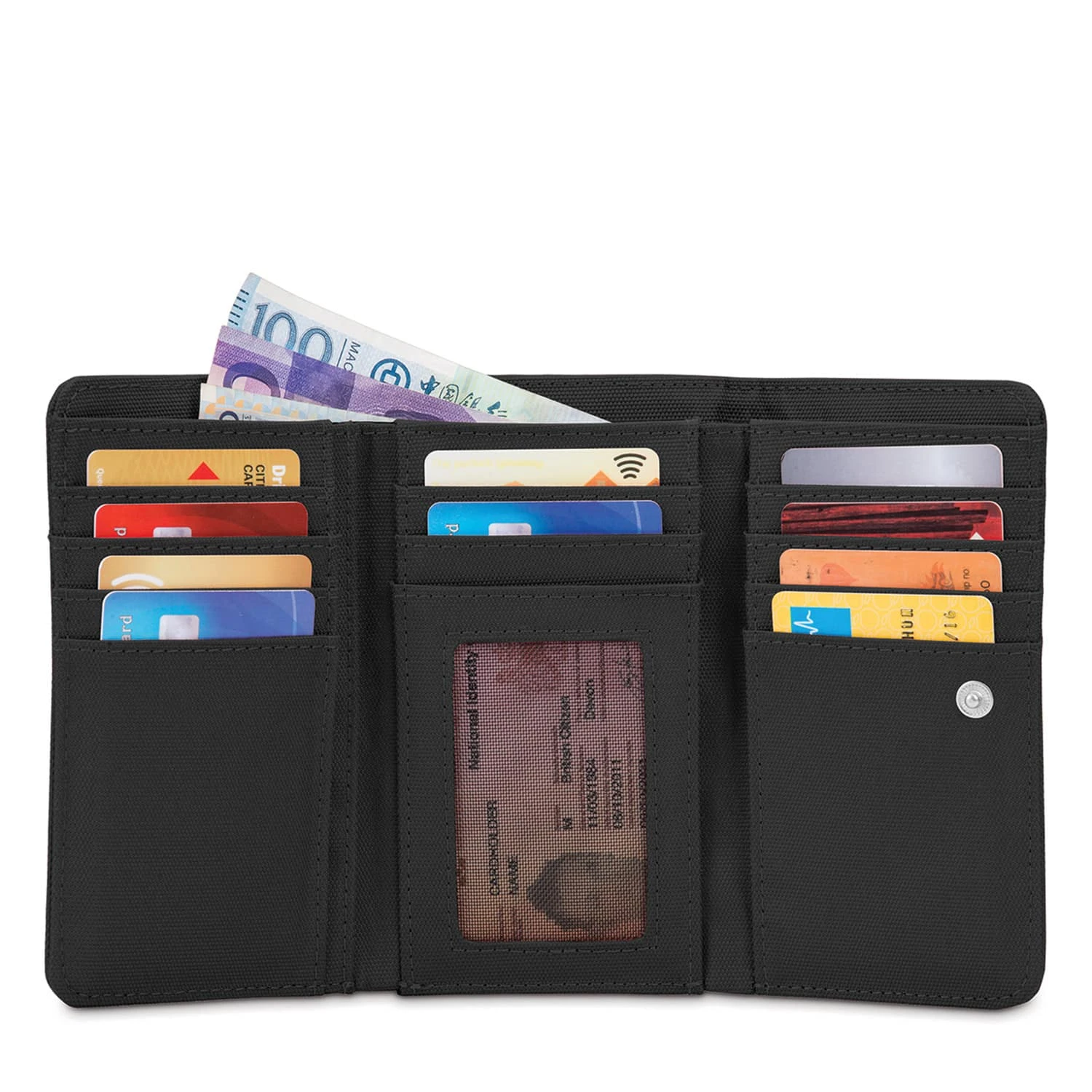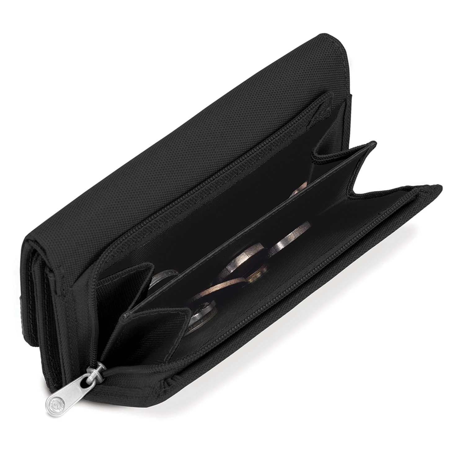The RFIDsafe LX100 gives you peace of mind while you commute or explore. The RFIDsafe blocking material helps you avoid scan scams and features 11 card slots including an ID mesh slot plus four slip pockets.