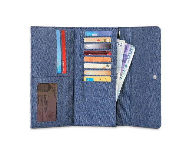 Smart and secure, the RFIDsafe™ LX200 is designed to organise and protect your everyday essentials. The RFID blocking clutch wallet features a zippered internal coin pocket, note slot, 11 card slots, one side slip pocket and a snap button closure. The slim and streamlined design is crafted using RFIDsafe™ blocking material to help avoid scan scams. It can also double up as a small clutch, with space for a smartphone and your lipgloss.
