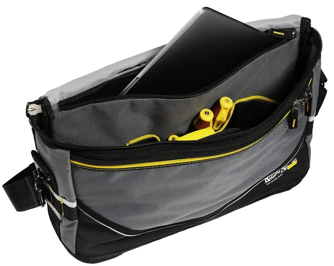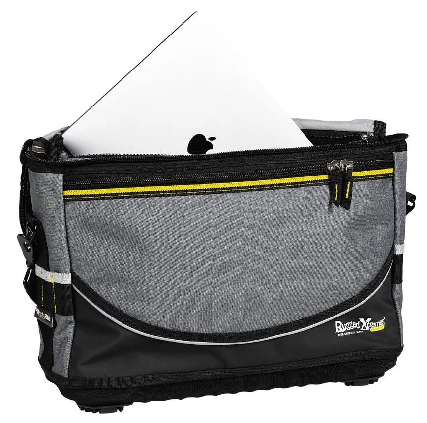 Carry your office gear in this heavy duty padded laptop satchel thats built to last. It has a zippered laptop sleeve, pen and card organiser and organisational pockets for chargers, papers and the bits you need.