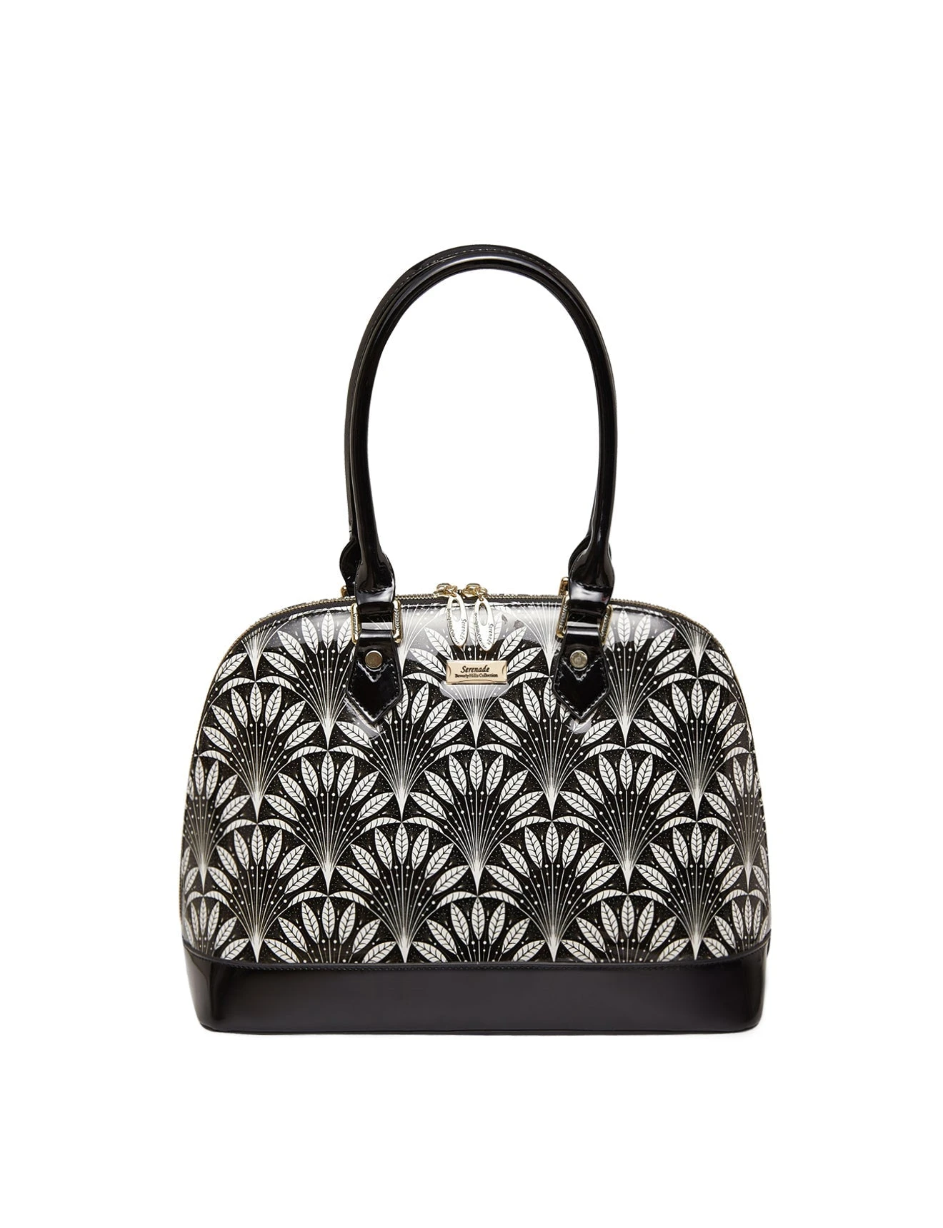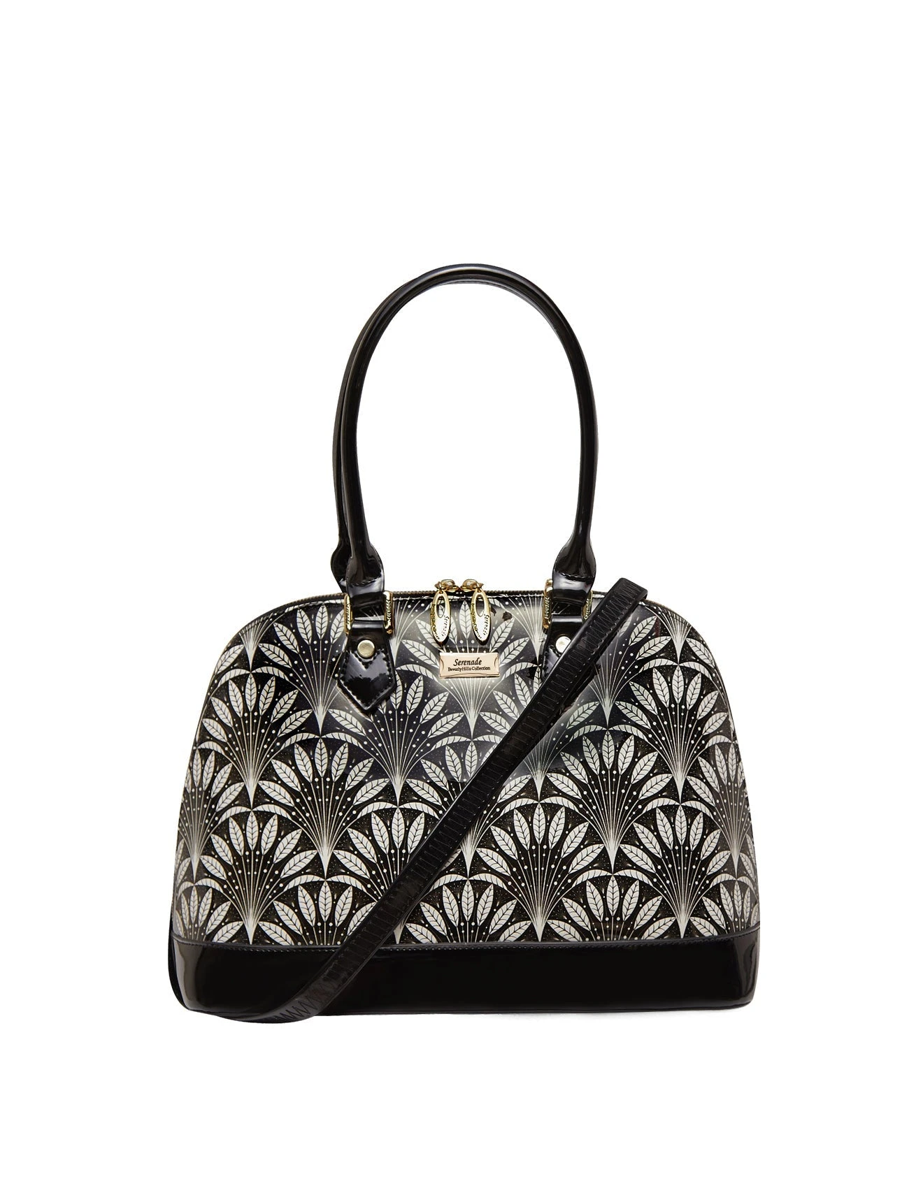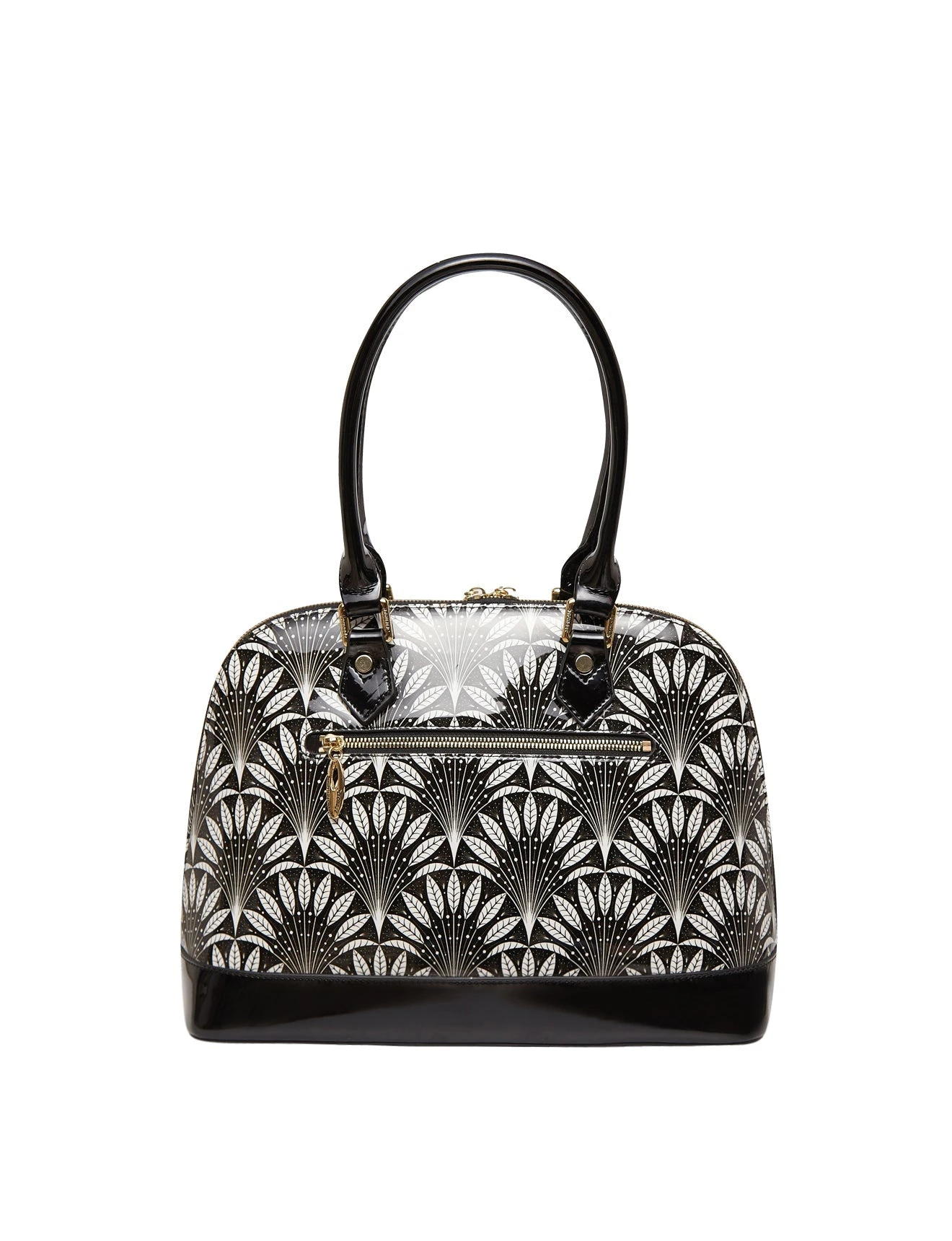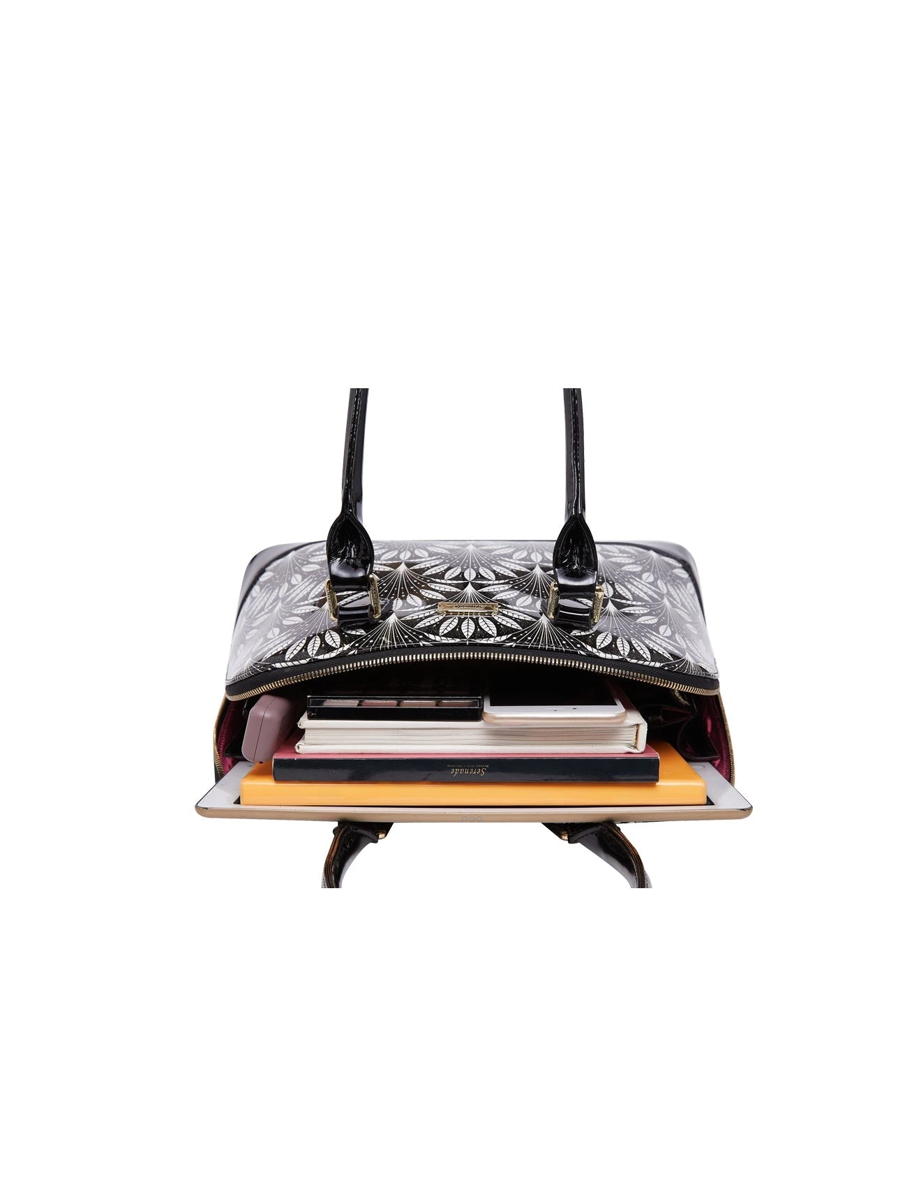 This Serenade Beverly Hills Collection Art Deco handbag is perfect for everyday. Crafted from premium leather with a patent finish, featuring 2 interior zippered compartments, 2 interior slip pockets and an additional zippered compartment on the back of the bag.