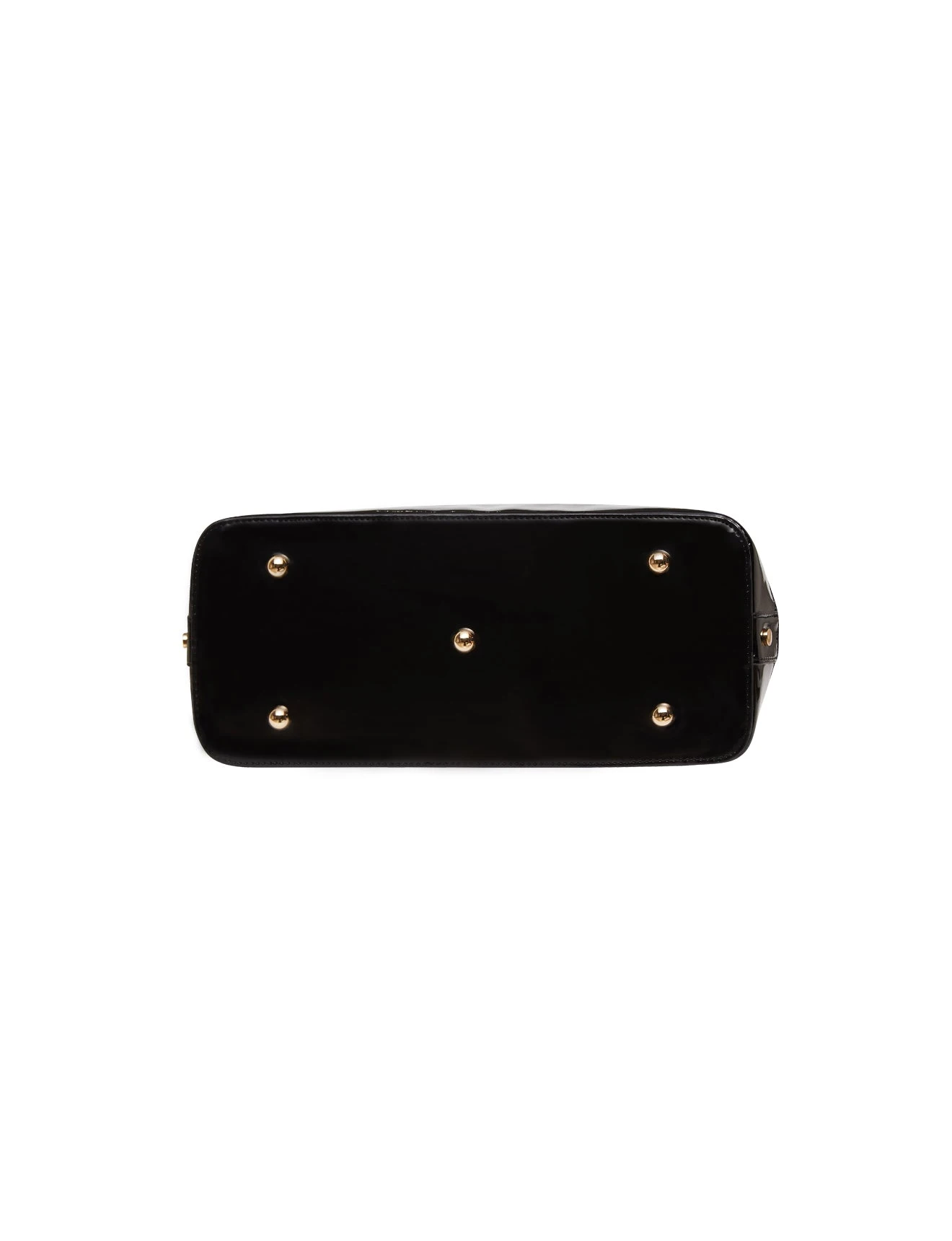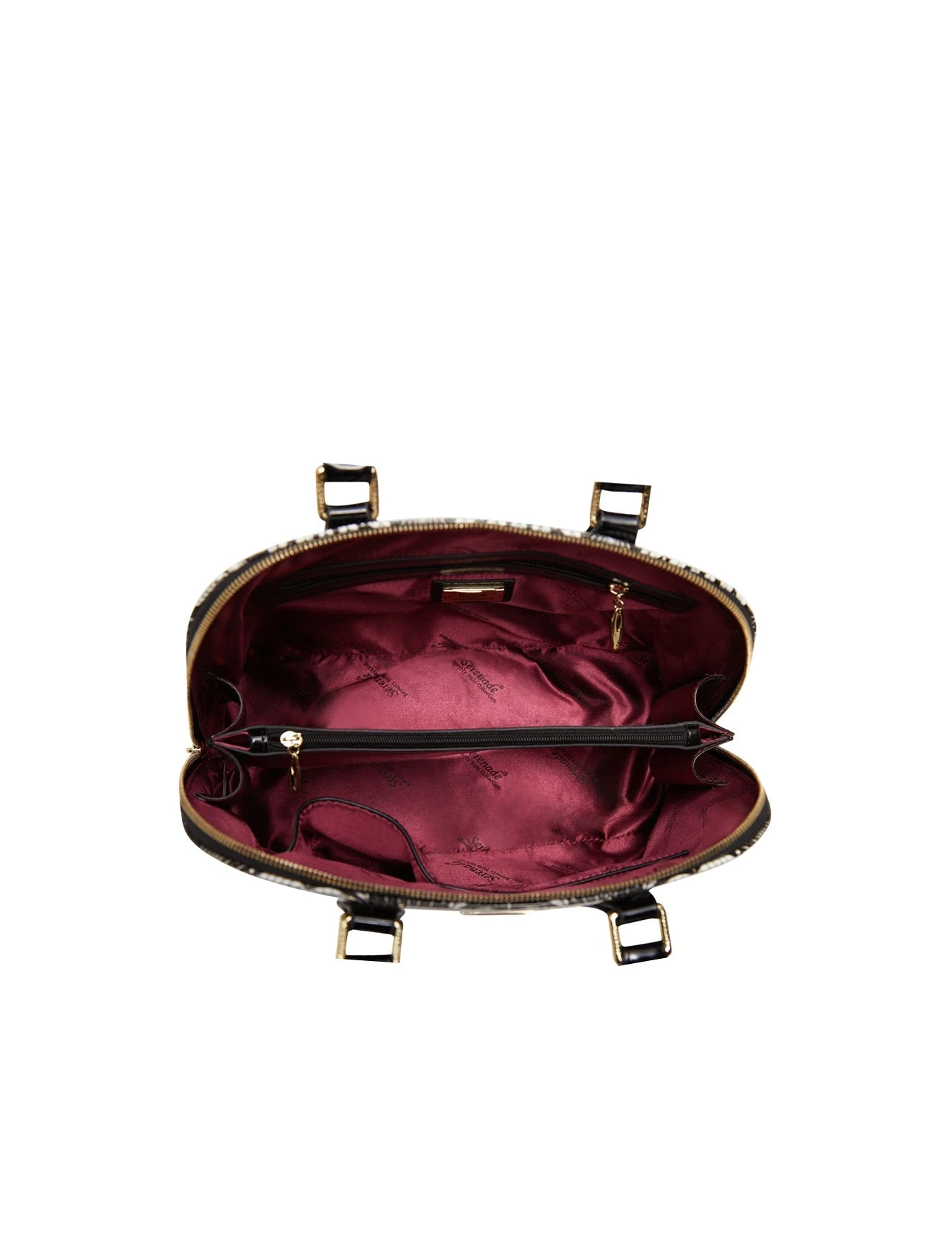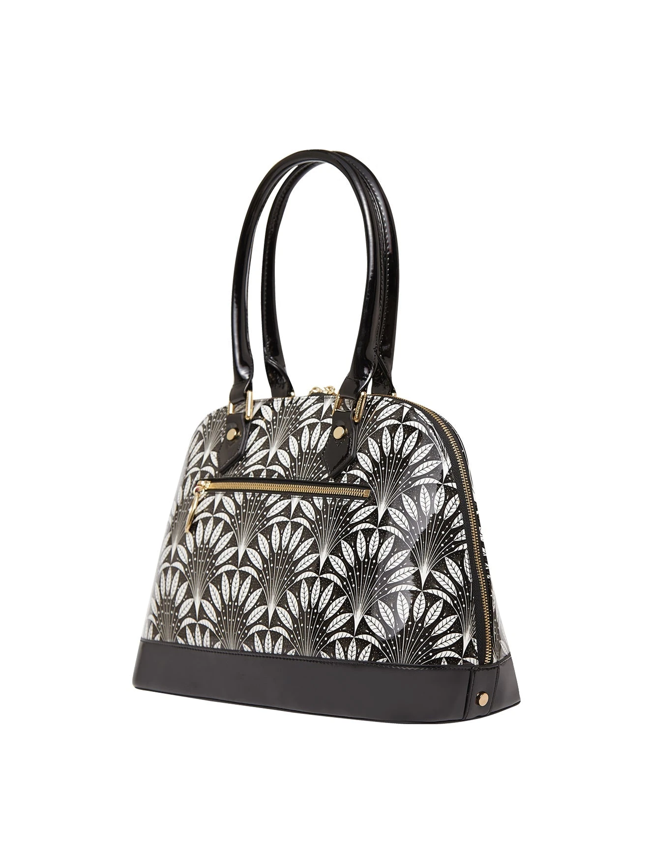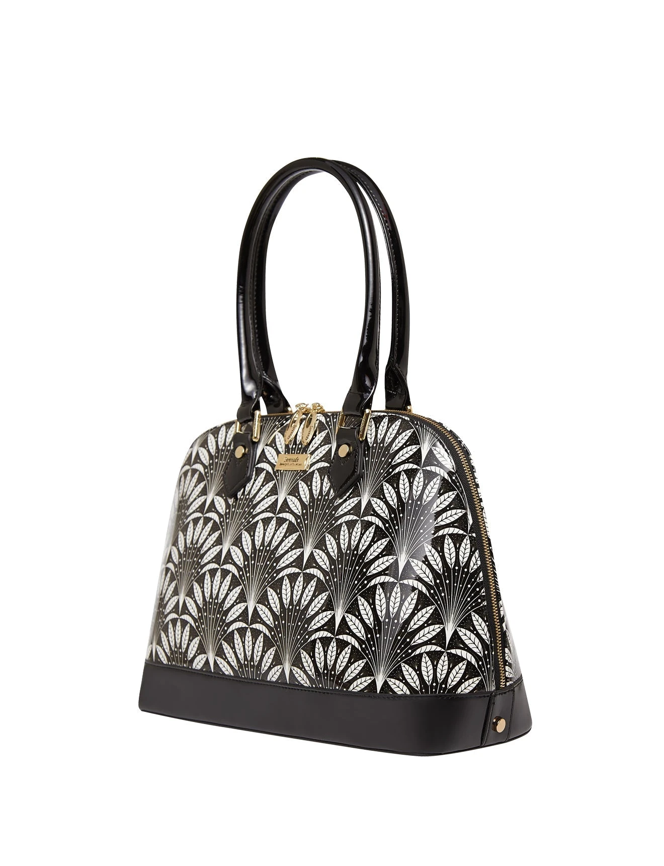This Serenade Beverly Hills Collection Art Deco handbag is perfect for everyday. Crafted from premium leather with a patent finish, featuring 2 interior zippered compartments, 2 interior slip pockets and an additional zippered compartment on the back of the bag.