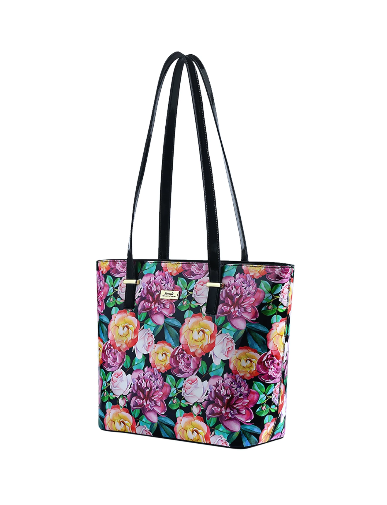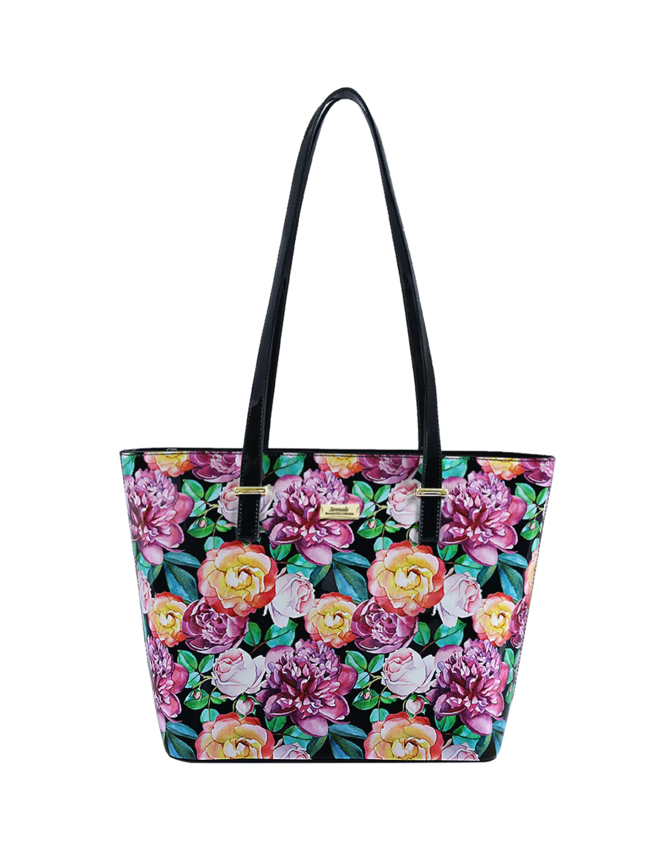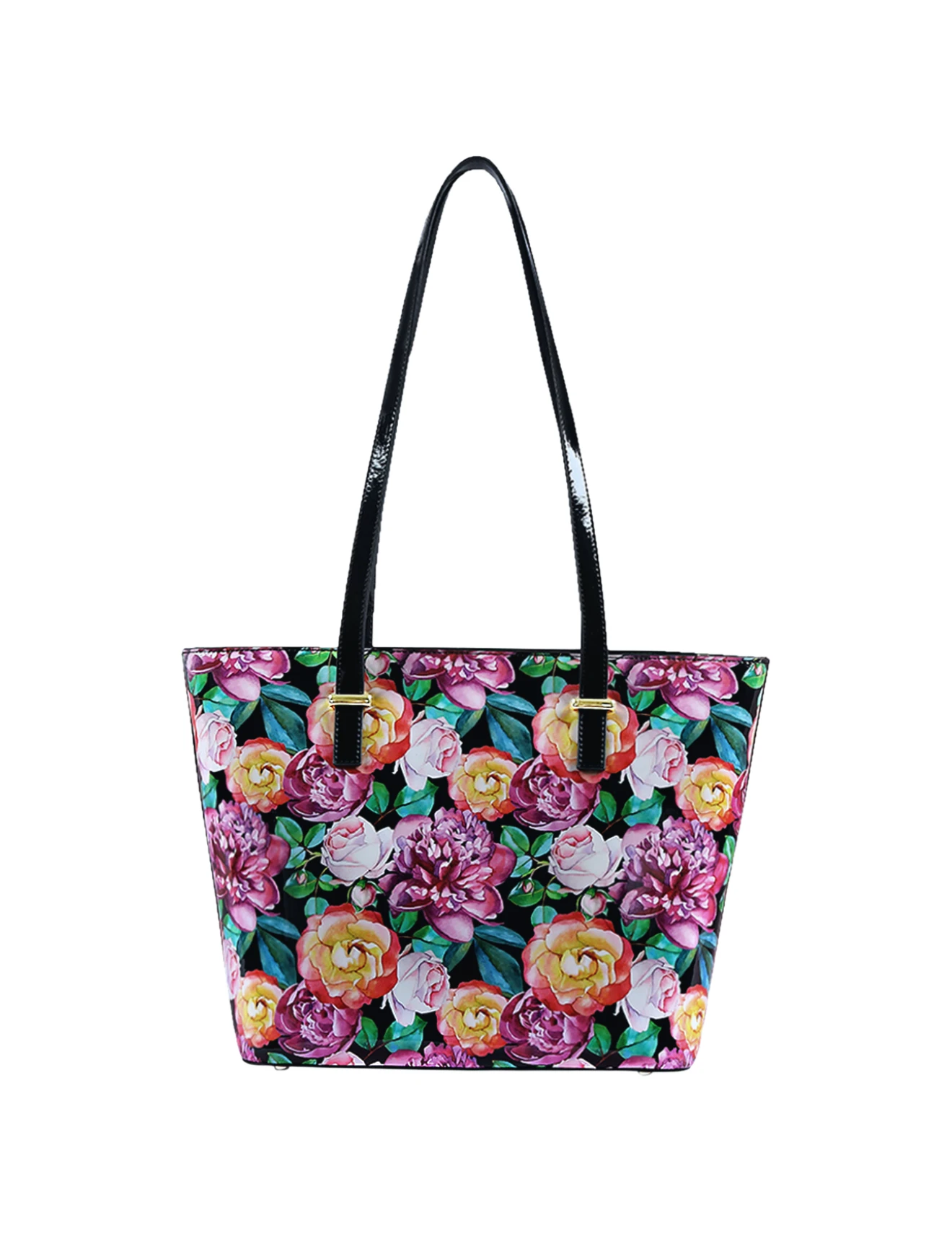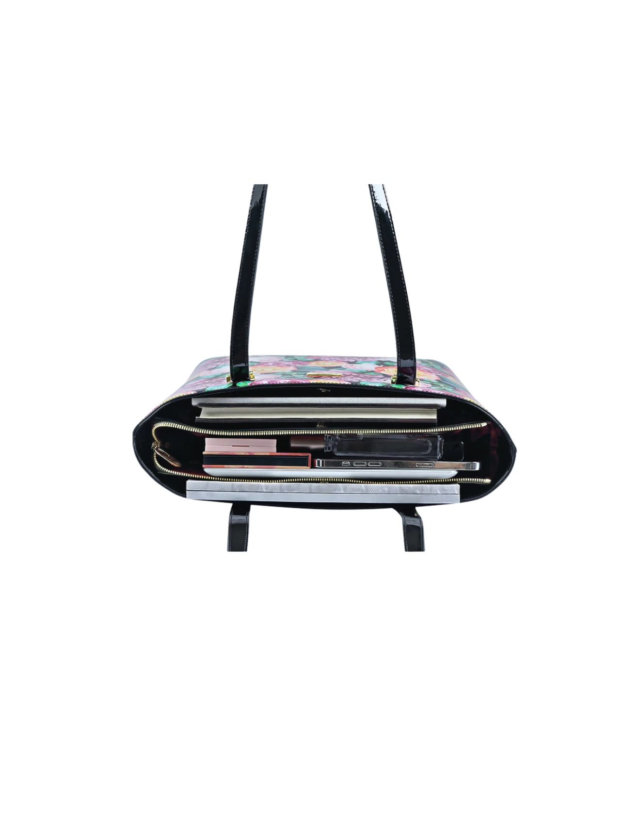 This Serenade Beverly Hills Collection, Austin Rose leather tote bag is perfect for everyday. Crafted from premium leather with a patent finish. This bag opens easily and features a central zippered compartment as well as two magnetic snap closure compartments.