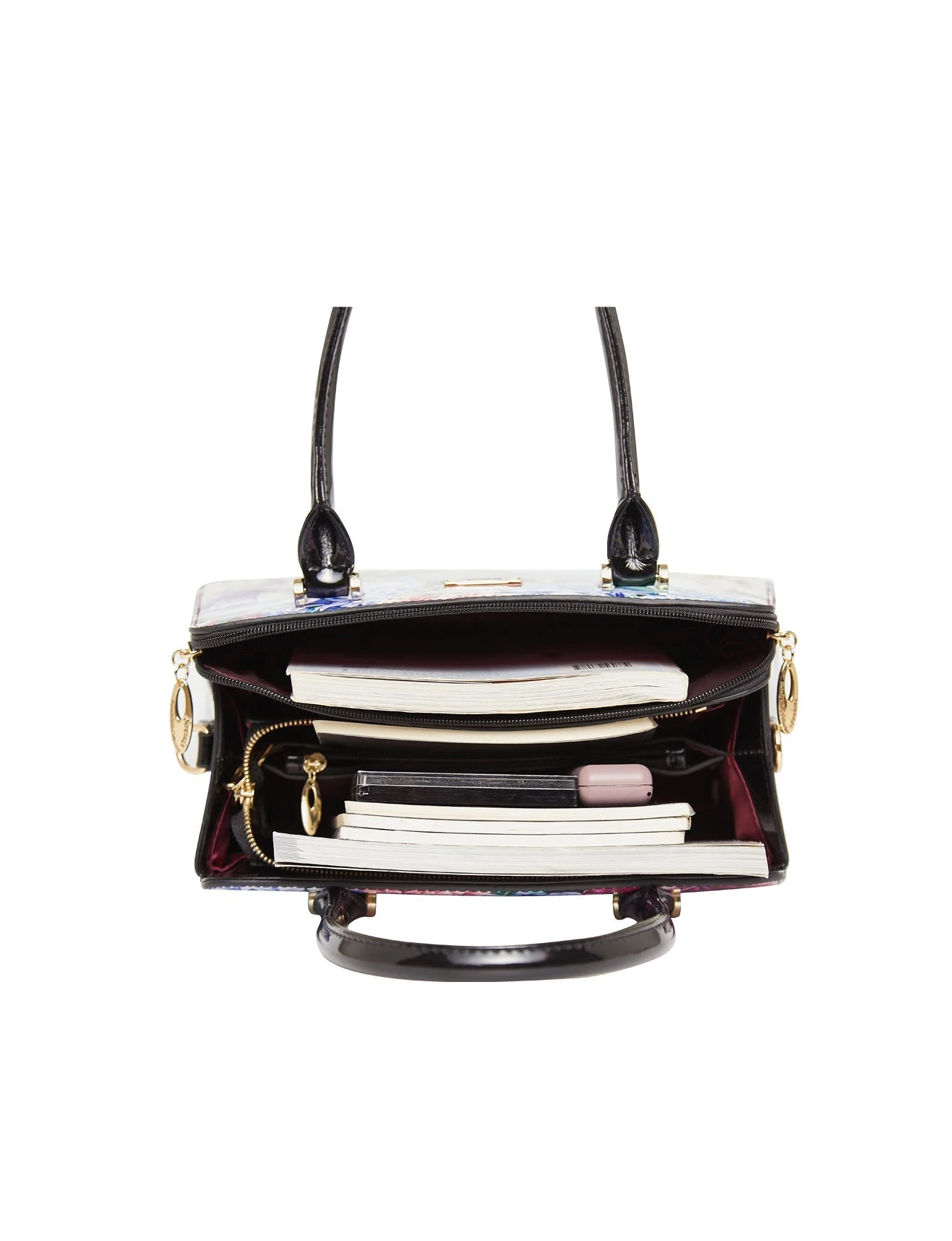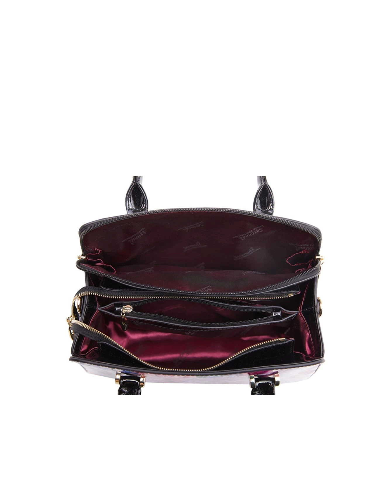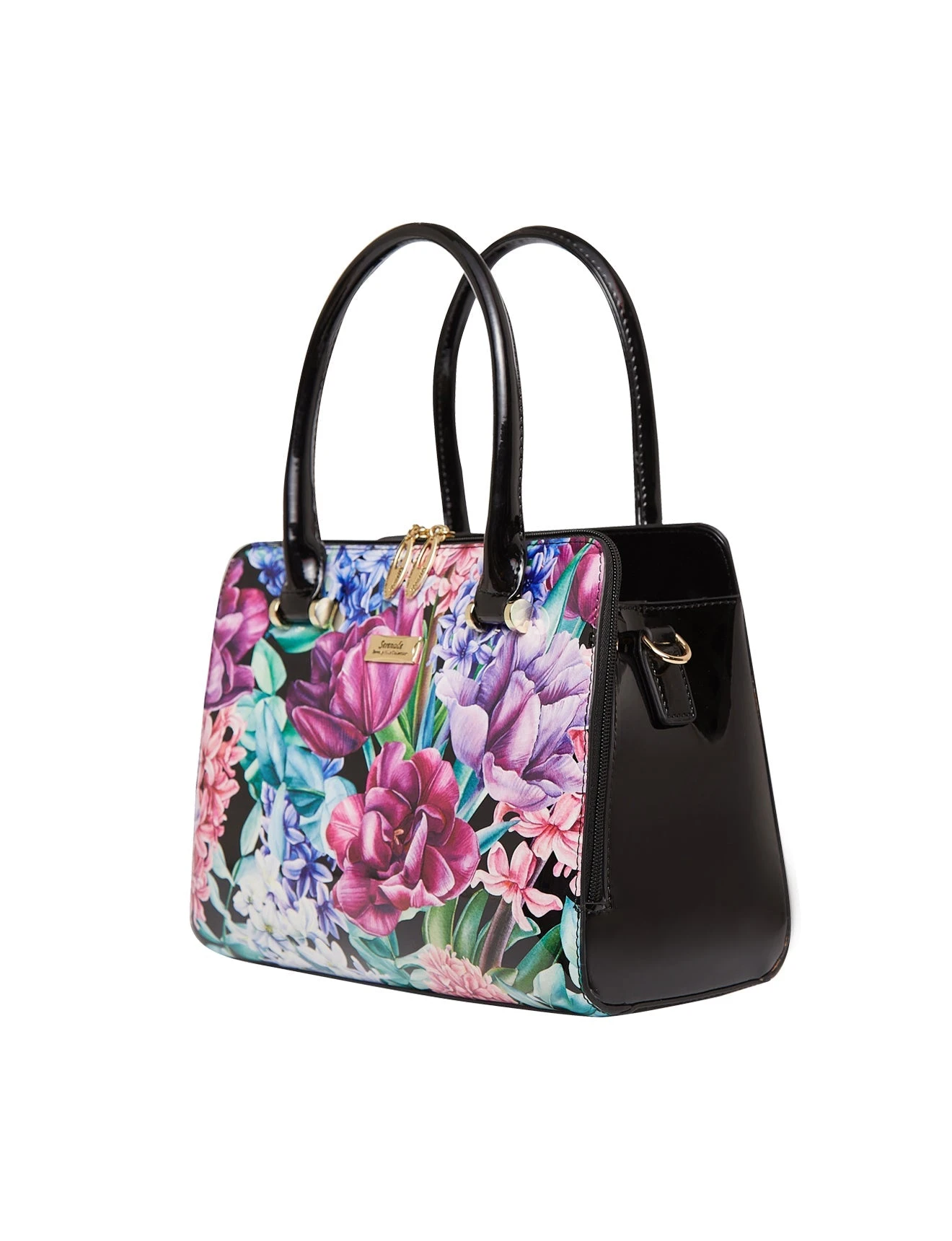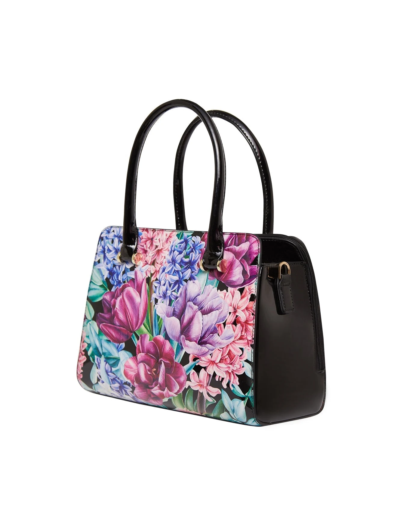 This Serenade Beverly Hills Collection Hyacinth print patent Leather handbag is perfect for everyday. Crafted from premium leather, featuring two main zip compartments one with an interior zip and two interior slip pockets. Ideal for organising all your belongings.
