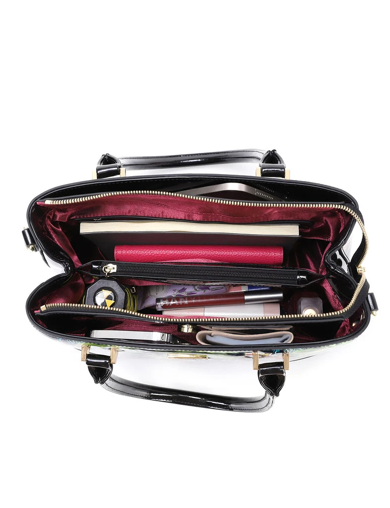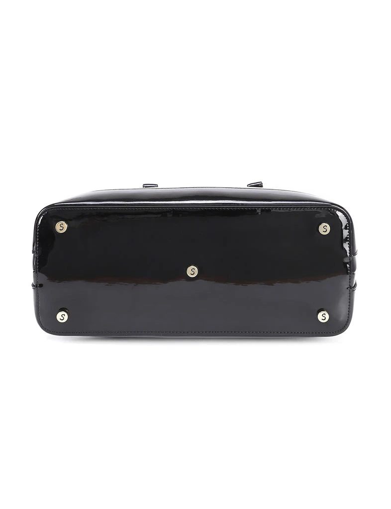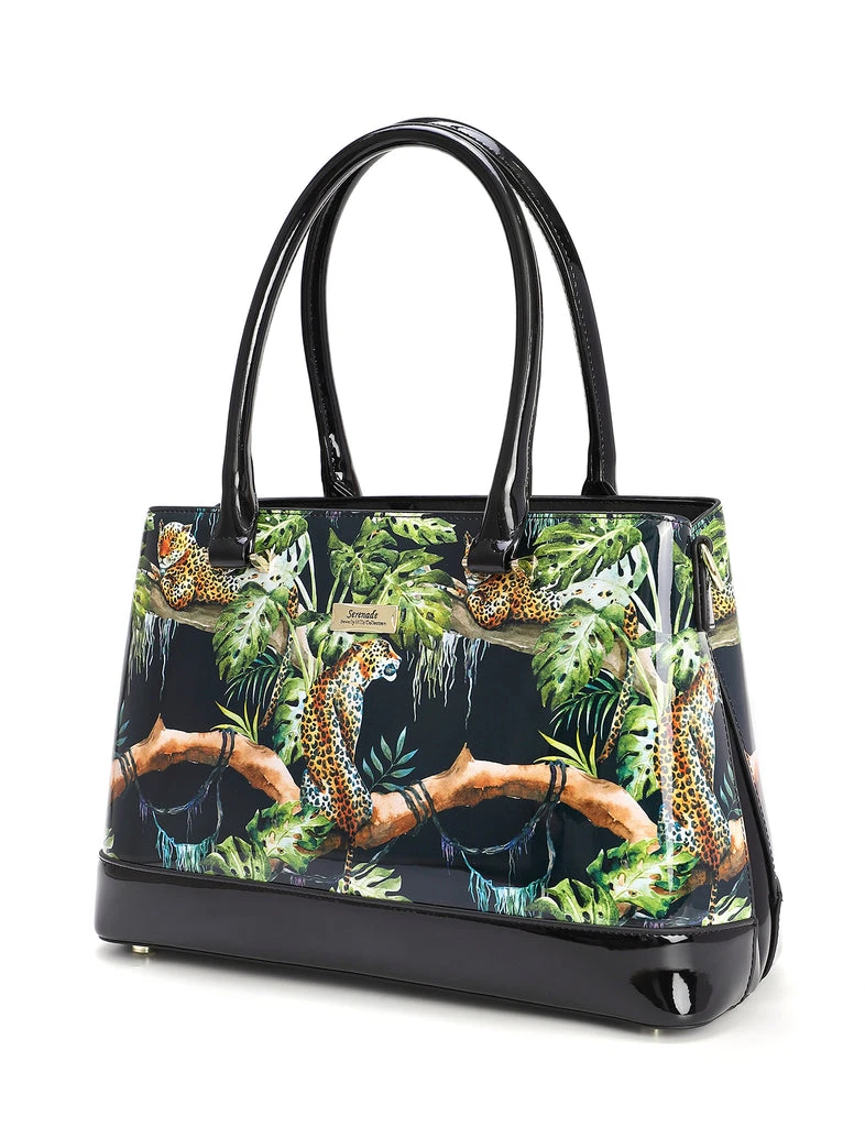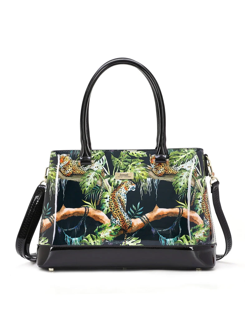 This Serenade Beverly Hills Collection Sierra patent leather handbag is perfect for everyday use. Crafted from premium leather, featuring a stunning floral pattern, two interior zippered compartments, 2 interior slip pockets and an external zip compartment ideal for organising all your belongings.
